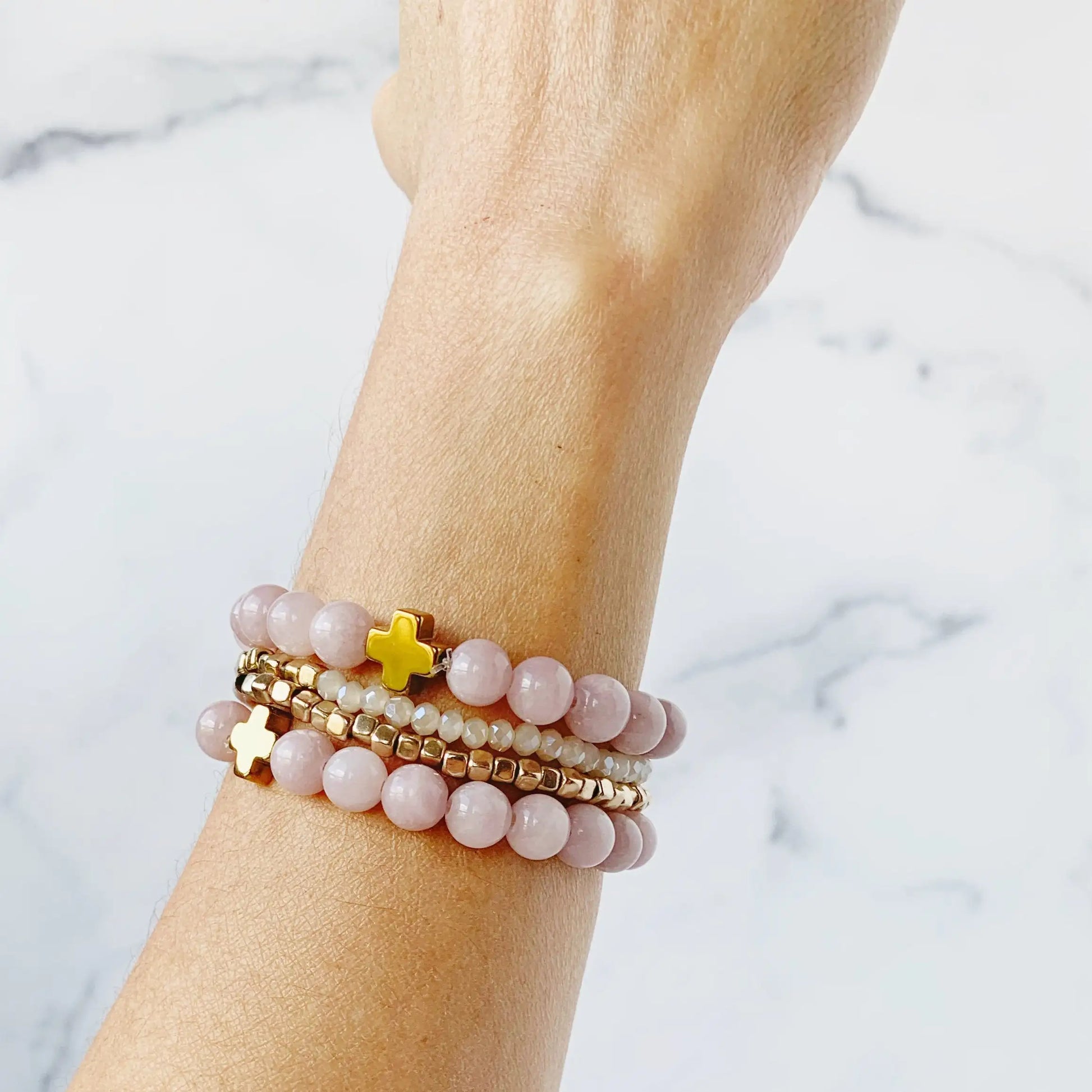 This sweet squad includes two rose quartz cuties with perfectly round beads and sparkly gold hematite crosses (because every bestie group needs some drama!), plus two smaller besties rocking square and round beads in gorgeous gold and nude tones. They're like that friend group that always coordinates their outfits! 👯‍♀️